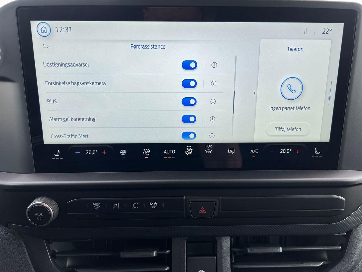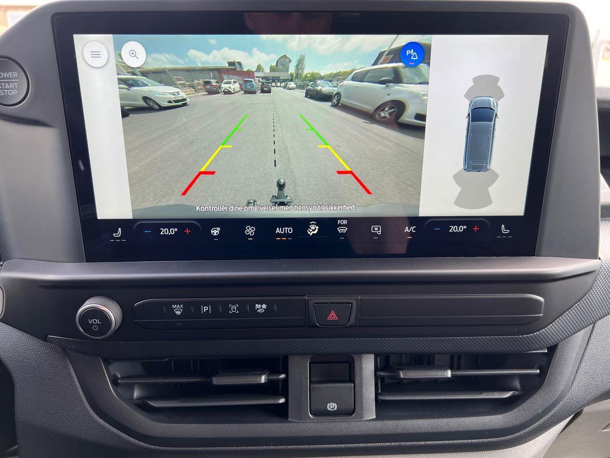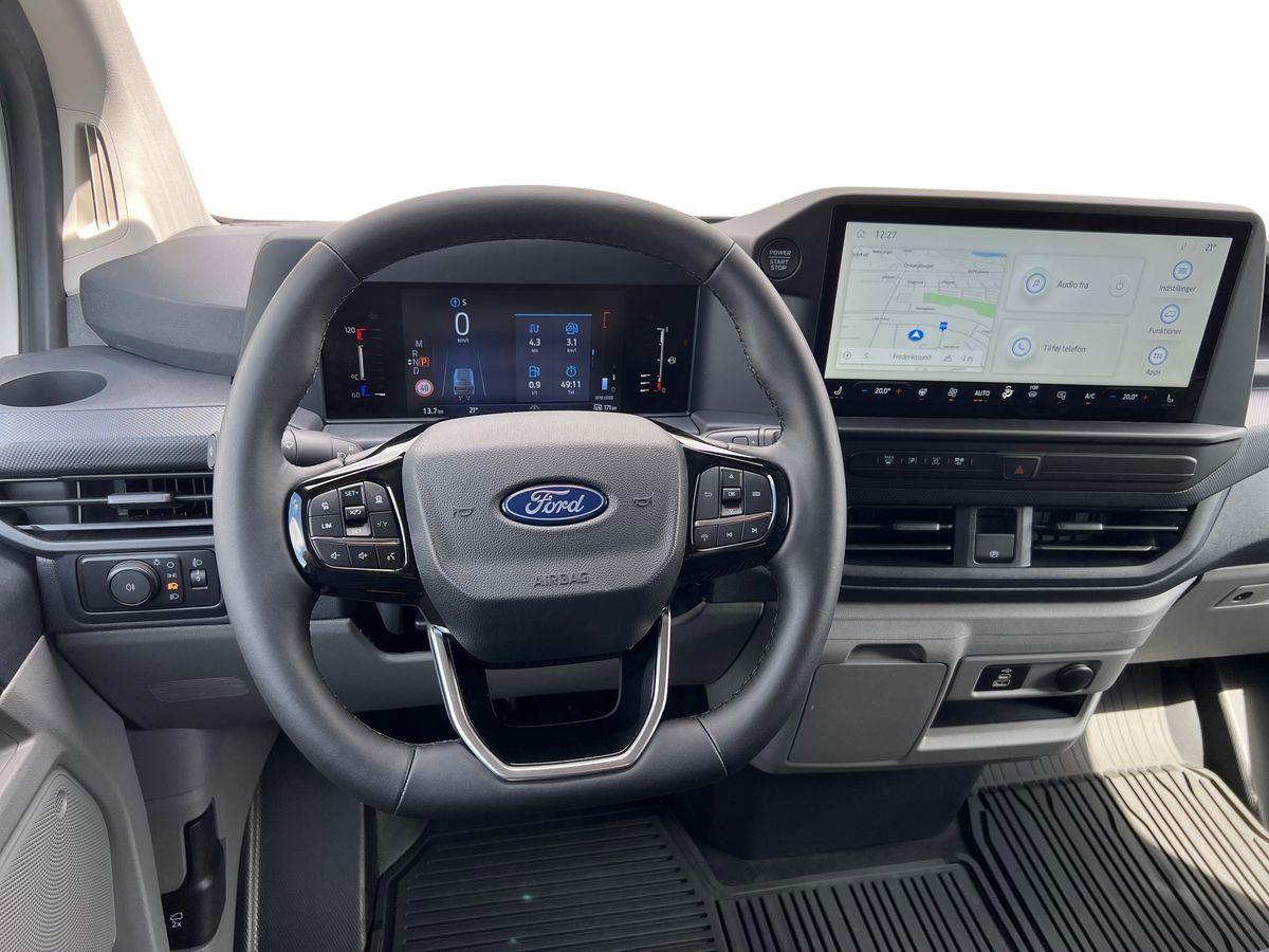 UDSTYR: Hvid, Træk, Tagbøjler, Fyr med fjernbetejning, 2 Zoner Klimaanlæg med A/C, helårsdæk, Blind vinkel alarm, Adaptiv fartpilot, Opvarmet rat, 12" skærm med bakkamera, Ford Navigation og trådløs Appel Car-Play, El-ruder, Fj bet centrallås, 3 sæder, Skydedør i højre side og i venstre side,Træ bund og sider i varerum, P-sensor for og bag, Board-computer, Diverse aflæggerum, ABS, ESP, Airbags, LED lys i varerum. Led forlygter, Sædevarme og meget mere udstyr i den populære Limited model.