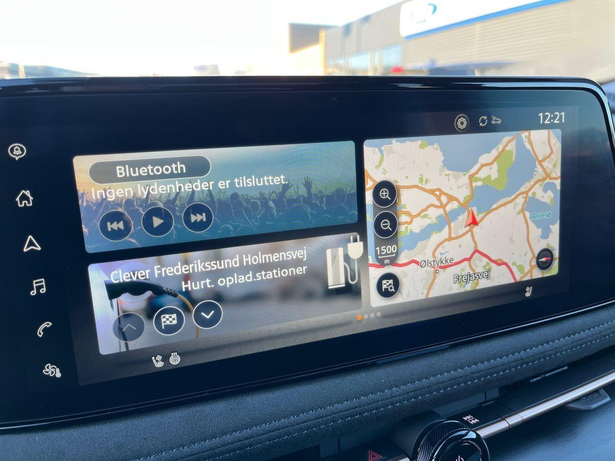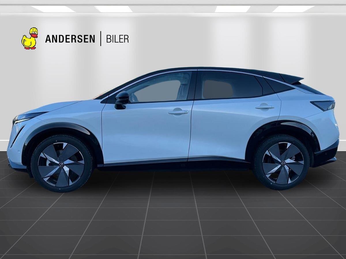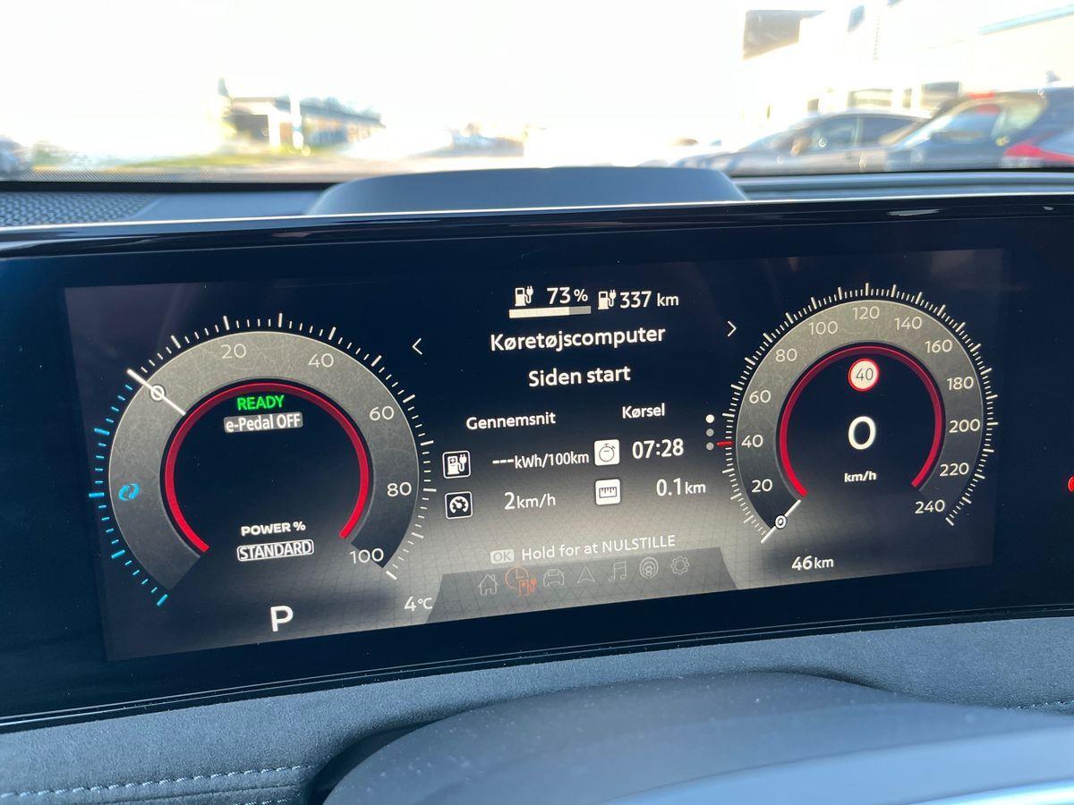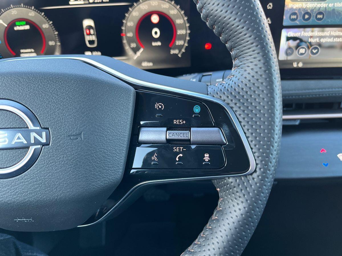 UDSTYR: Automatgear, 238 HK El-motor, 20" alufælge, Forhjulstræk, 2 zone klimaanlæg, Varme i forruden, Varme i rat, Varme i for og bagsæder, El-justerbart førersæde, 360 graders bak-kamera, Integreret Nissan Connect navigation, Radio med FM og DAB, Kollisionsradar, Aktiv fartpilot som kan holde hastighed til forankørende, tilpasses vejsklilte rundkørsler mv, De fine 20" Ariya alufælge, Bluetooth håndfri telefon, Digital instrumentering, Board-computer, Sædevarme, Tagrælinger, ABS, ESP, Elektrisk håndbremse, El åbning og lukning af bagklap, Bagklap kan tillige lukkes op ved at sparke ind under bilen... Elektrisk soltag, der kan åbnes, BOSE højttalere, Elektrisk midterkonsol, El-åbning af det ekstra handskerum i midten, Dellæder kabine, Memory på sæder i både fører og passagerside, Varme i bagsædet, Køling i forsæder, Kan delvis parkere selv.